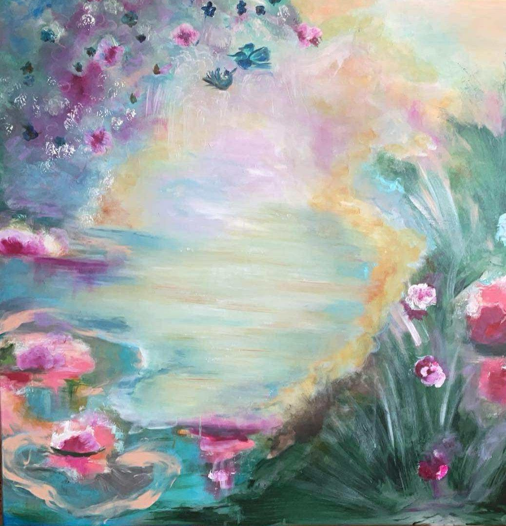 Dette værk inviterer dig ind i et stille, åbent rum mellem verdener – et sted hvor tid, tanker og grænser opløses. Farverne bevæger sig blidt, som vand og lys, og skaber en følelse af ro, dybde og indre klarhed.